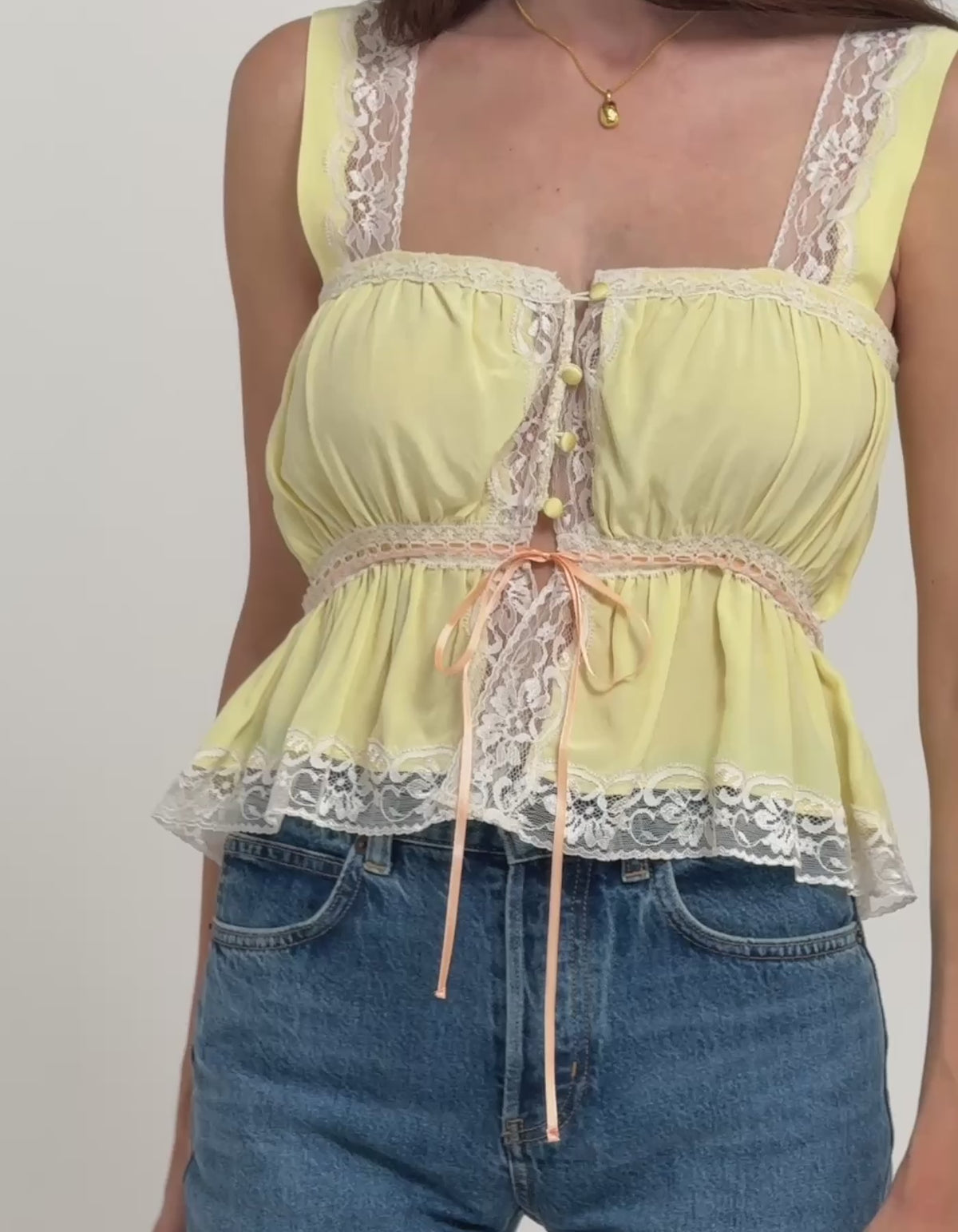 • V-neck tank with spaghetti straps and lace trim down center front with ivory buttons
