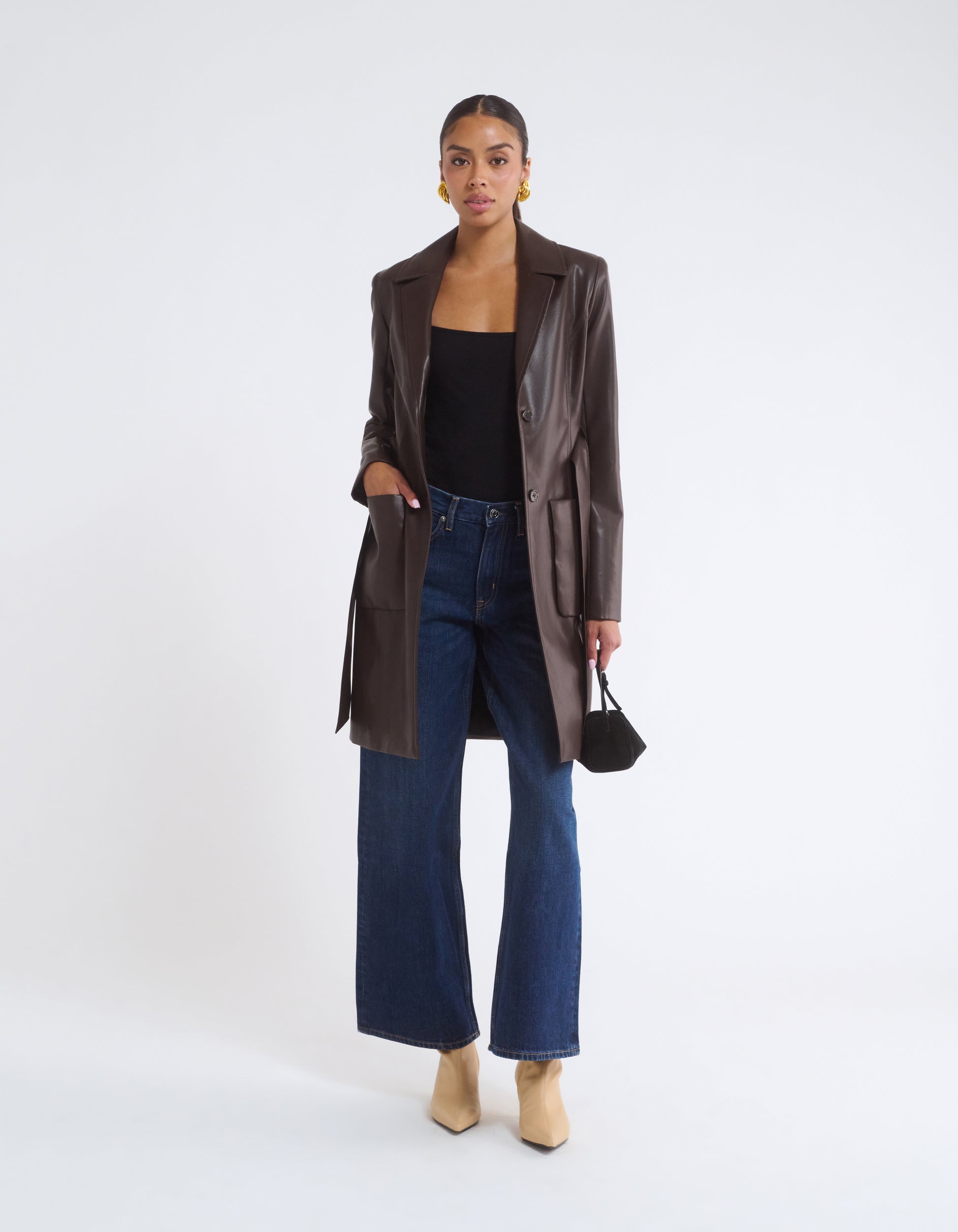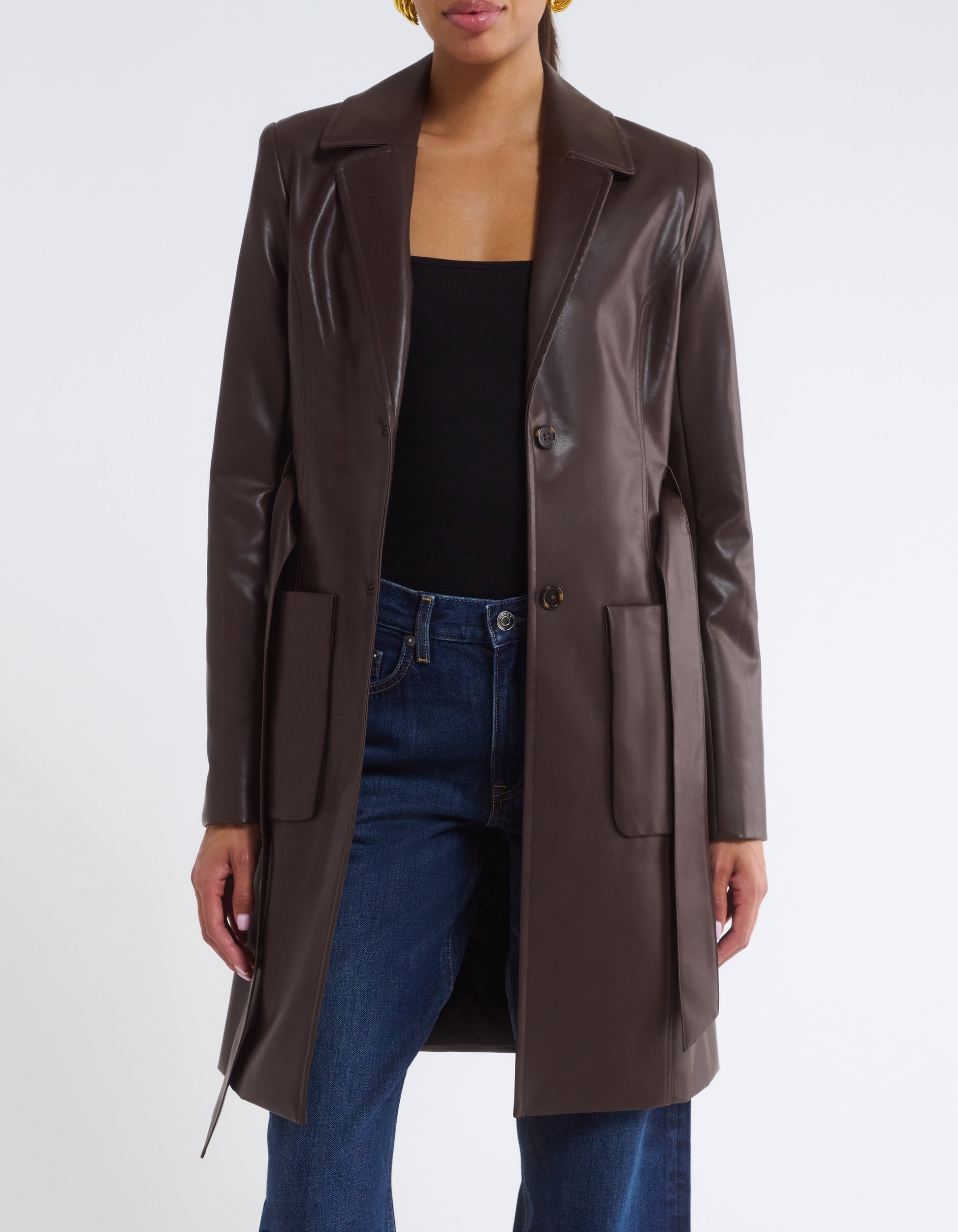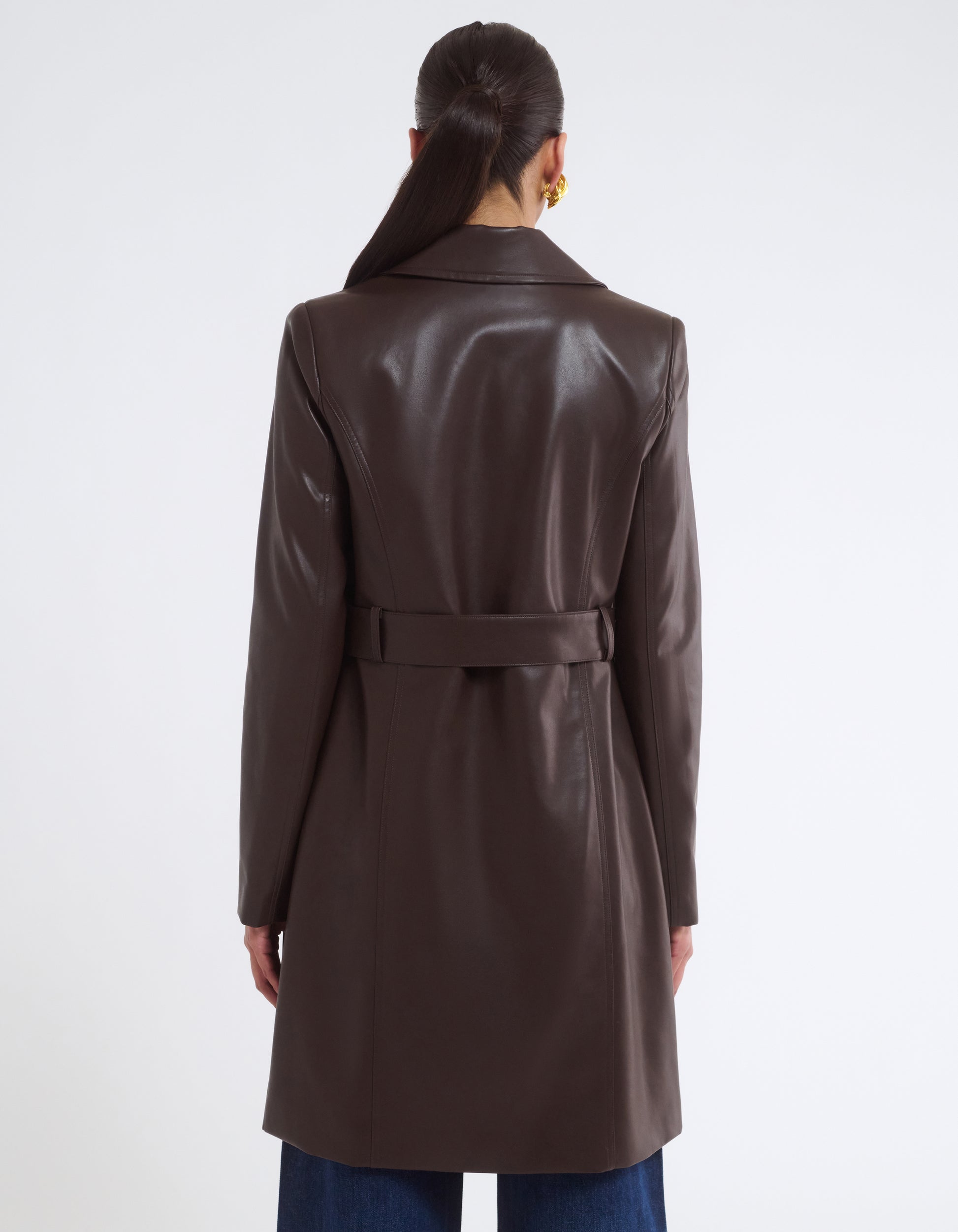 The season’s must-have trench serves up a buttery soft faux leather in a rich espresso hue.